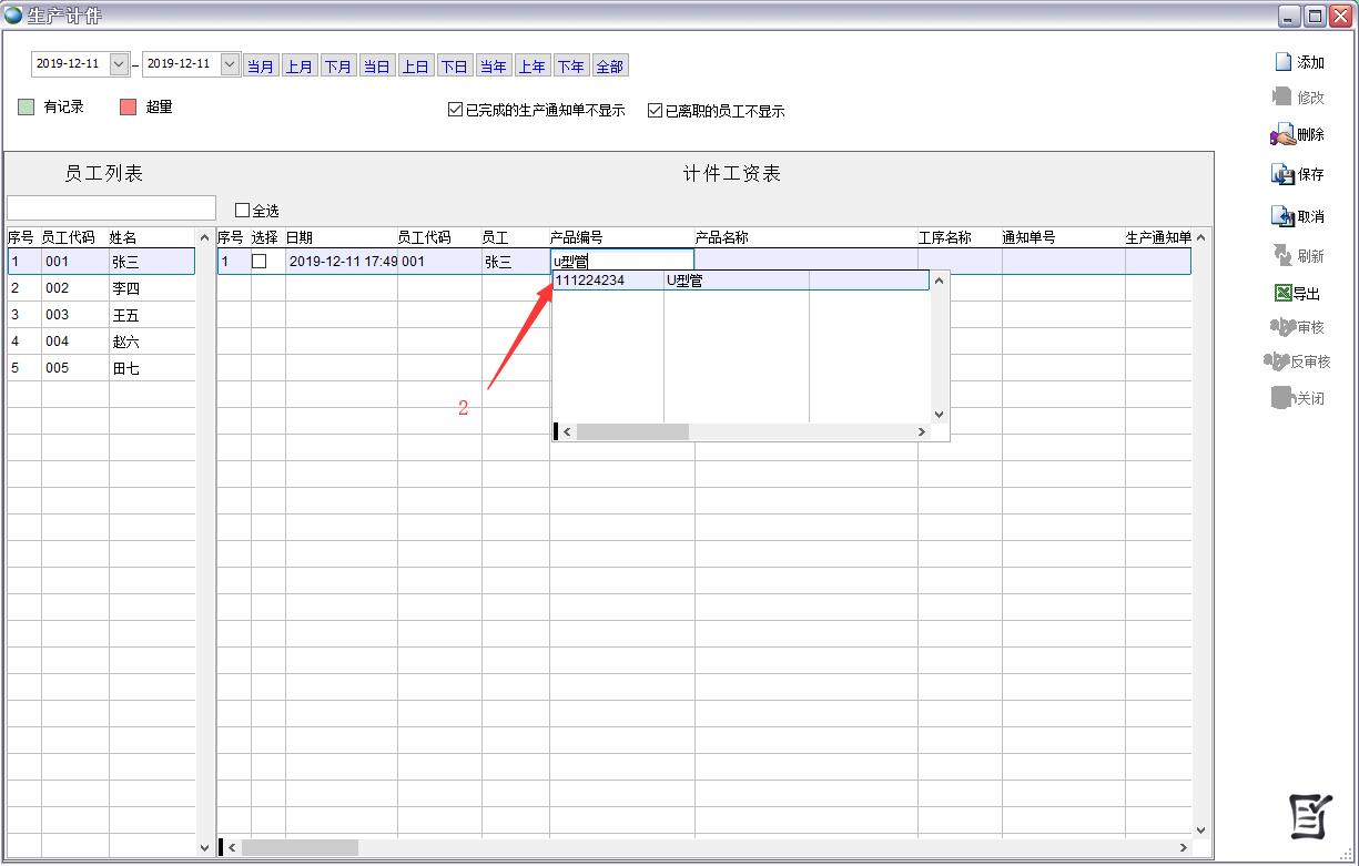 点击右侧的员工,可以只显示该员工的生产计件记录