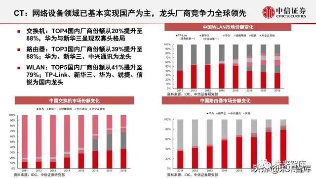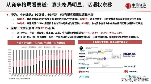 华为、中兴通讯:3G突破、4G并跑、5G有望实现超越逻辑未变:1G时代,摩托罗拉和AT&T两分天下,摩托罗拉独占70%份额;2G时代,话语权易主:北欧双雄诺基亚和爱立信登历史舞台 ;3G时代,高通凭借 CDMA 底层技术的专利许可费成为新巨头;4G时代,东方竞争者华为和中兴在第四代移动通信时代崛起。
