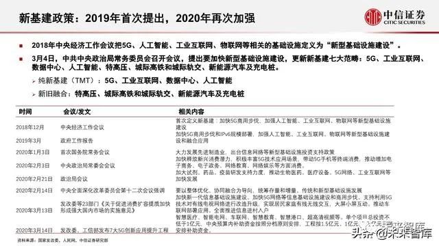 3月4日,中共中央政治局常务委员会召开会议,提出要加快新型基础设施建设,更新新基建七大范畴:5G、工业互联网、数据中心、人工智能、特高压、城际高铁和城际轨交、新能源汽车及充电桩。