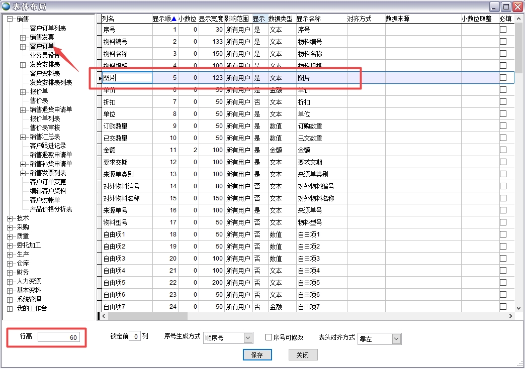 在表体布局中将图片列设置为显示,并修改默认的行高