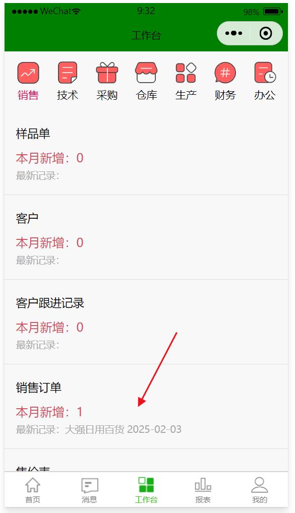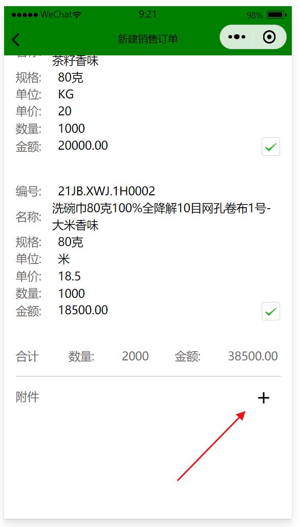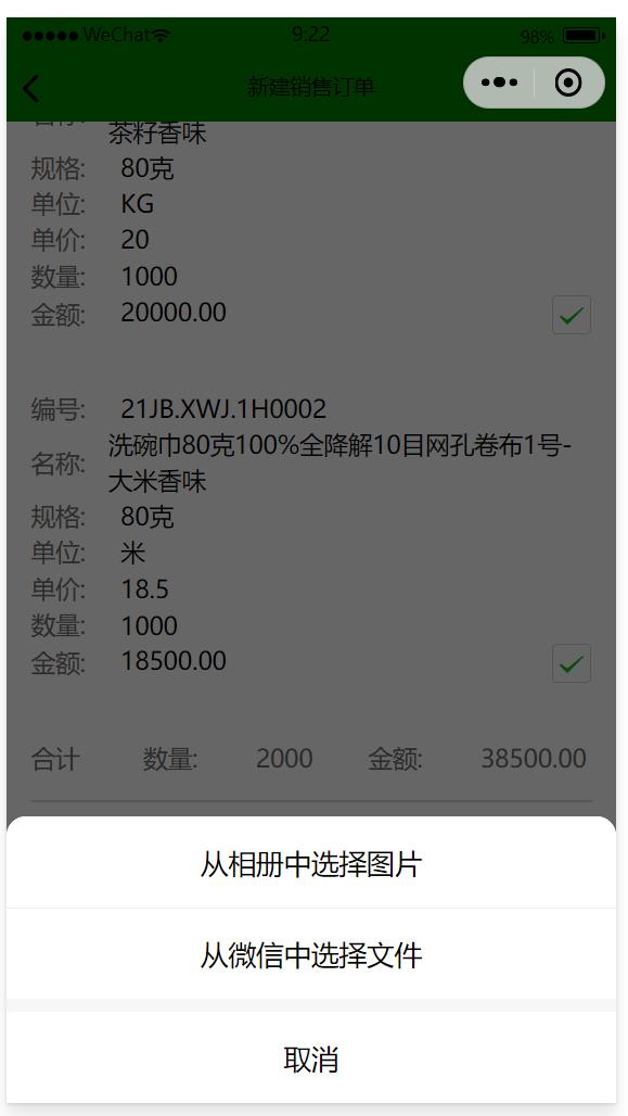 反审批 审批后的单据不会出现在待审批记录中,可以在工作台中找到该订单进行反审批 点反审核即可 产品图片 产品图片可以从手机端的商品表中直接上传,也可以从PC端的物料编码表中上传,图片会自动同步到手机端 新建 可以通过微信小程序直接做销售订单 使用手机做销售订单可以实现出差在外或异地办公的人员也能直接下销售订单,数据会实时同步到PC端,PC端人员在ERP系中继续完成该订单的后续业务。 1、点新建 相关知识