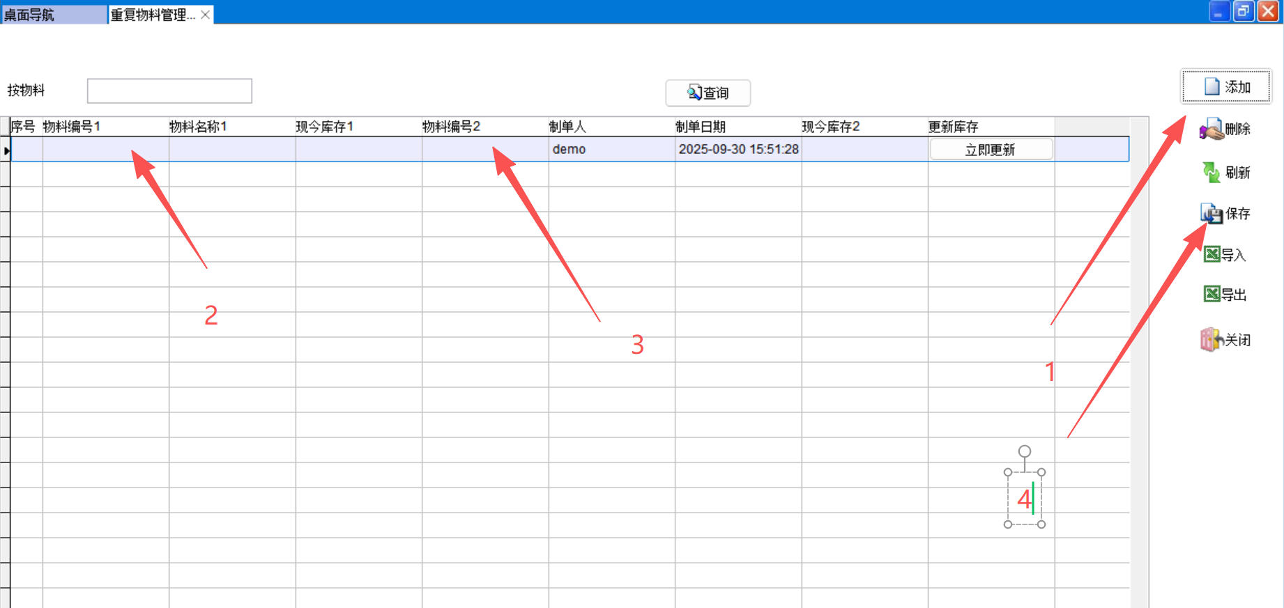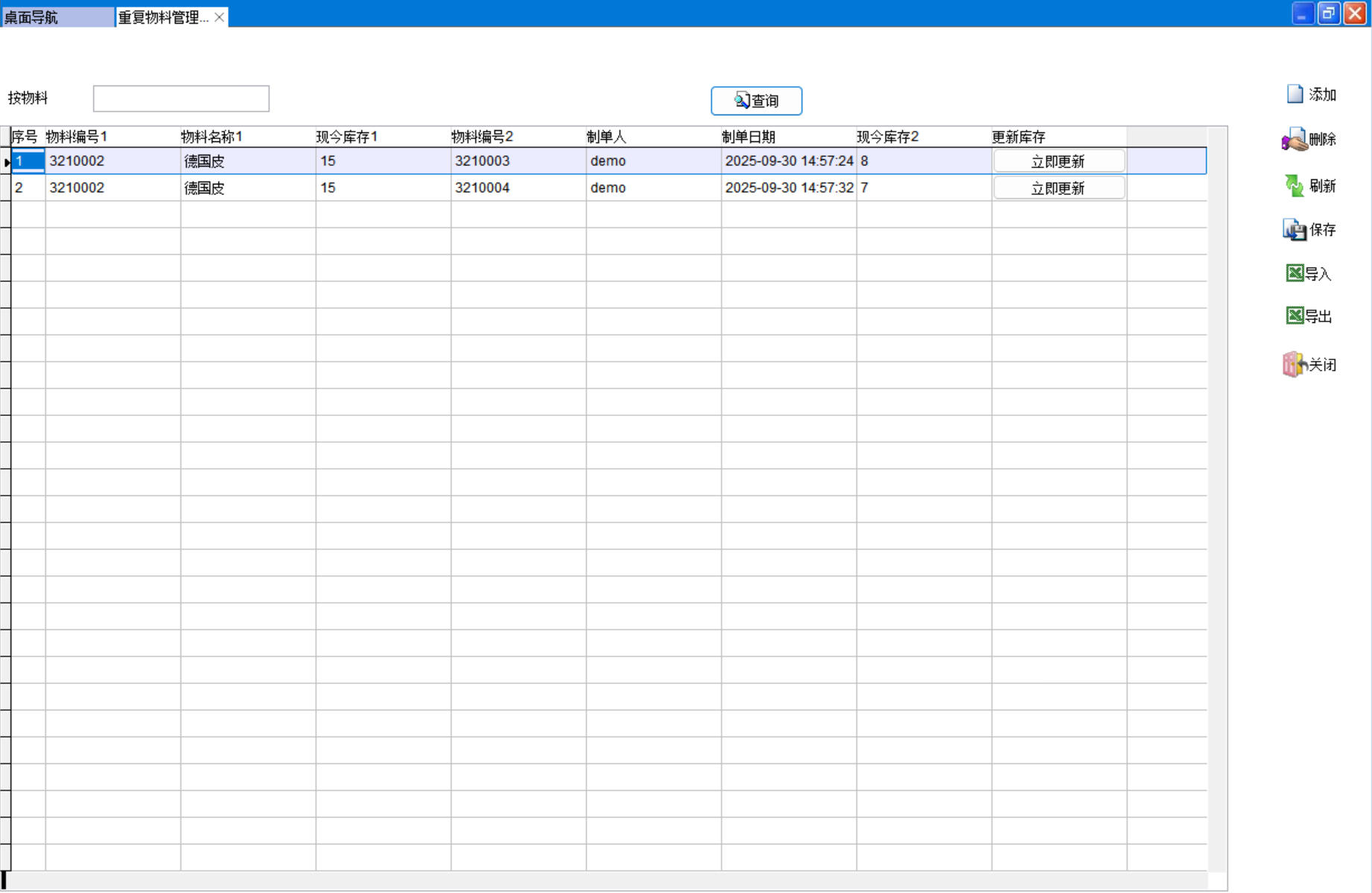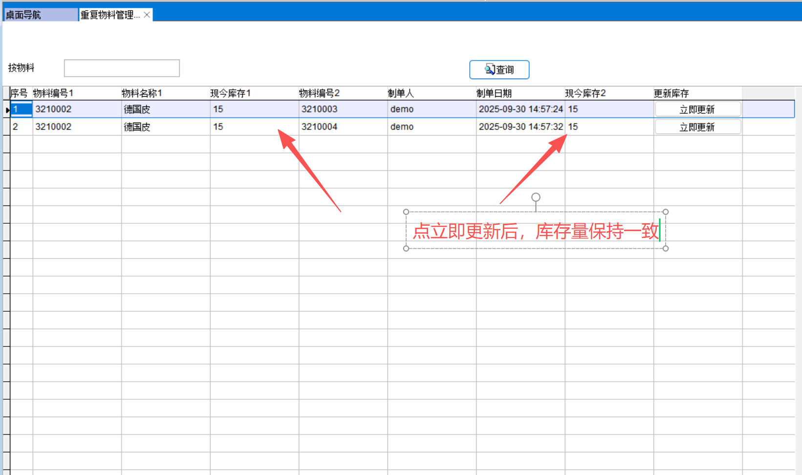 如上图所示,3210002、3210003、3210004是同一个物料,名称都相同,保存后在更新库存上点立即更新,更新后3个物料的库存就会保持一致,以后任意一个物料的出入库后,其他两个物料也会同步库存量。3个物料会始终保持库存一致。