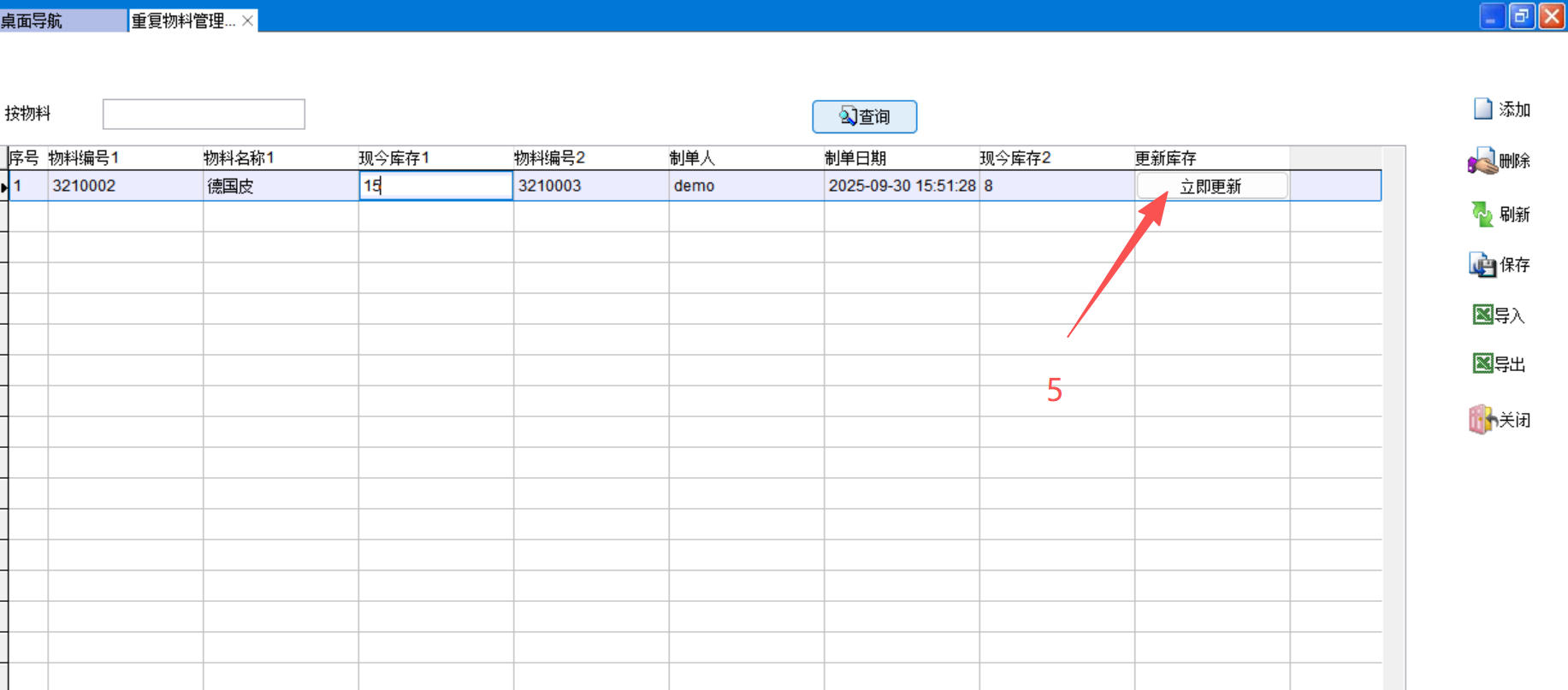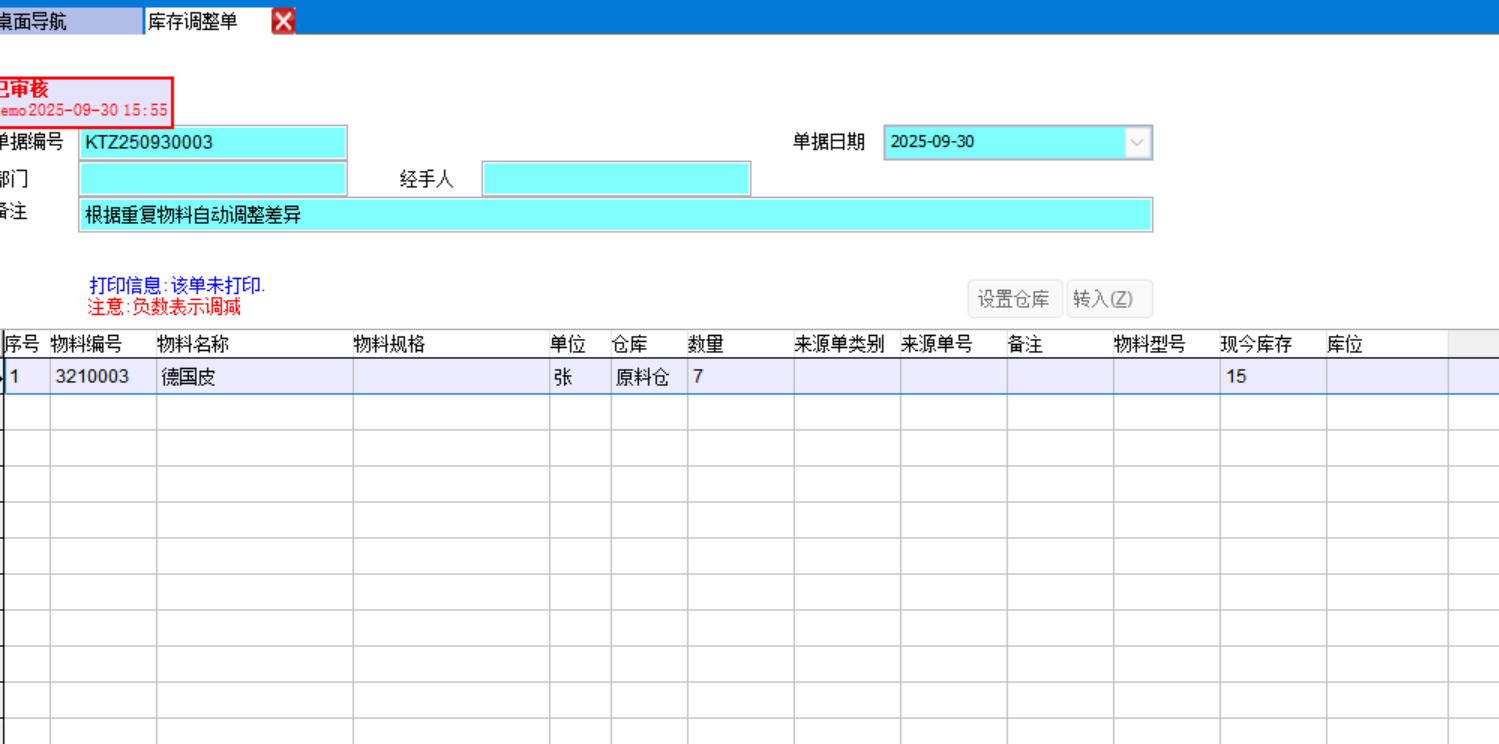 点立即更新后系统会自动生成一个库存调整单,将物料编号2的库存数量调整和物料编号1一致。