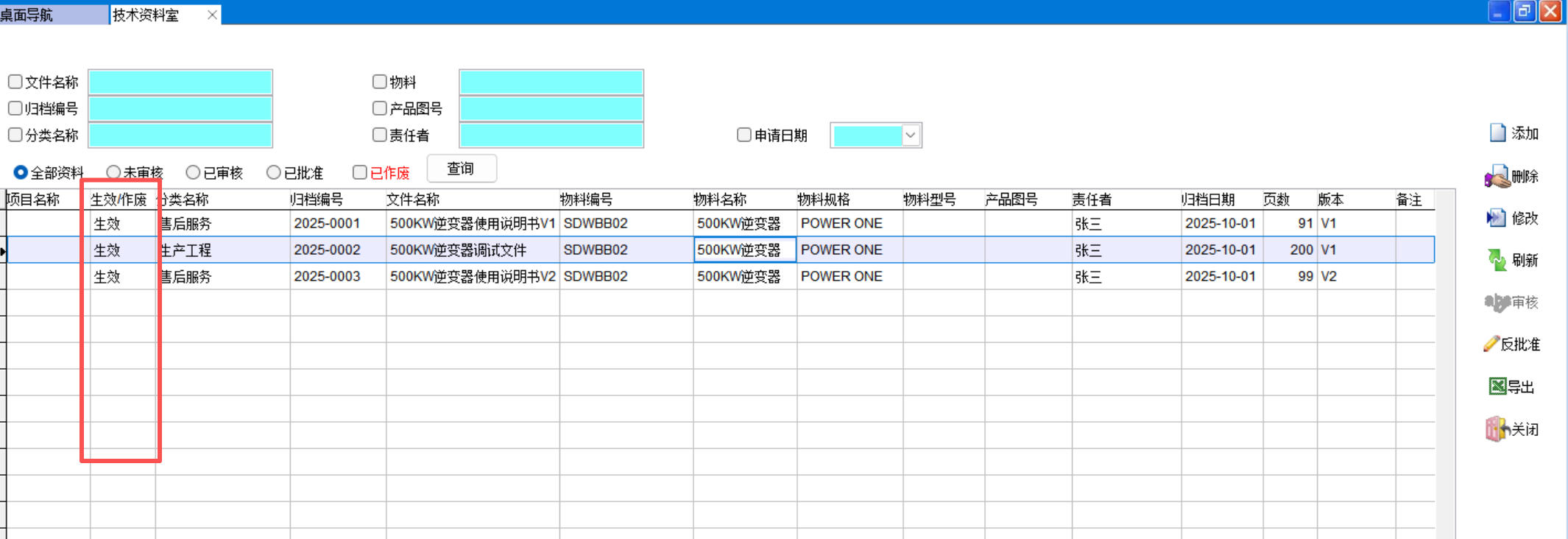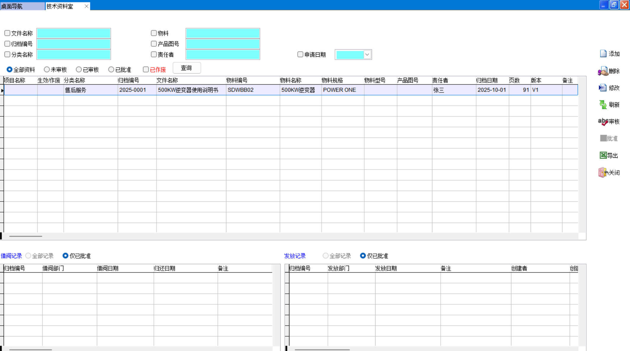 用于对技术资料进行档案化管理,包括分类、归档、借阅发放、作废。