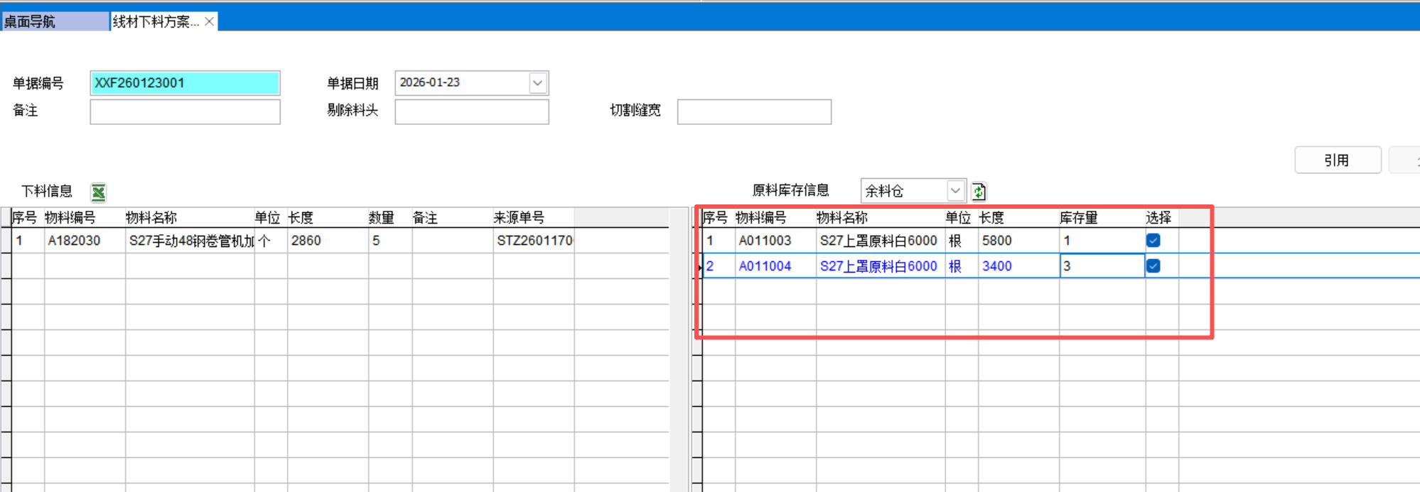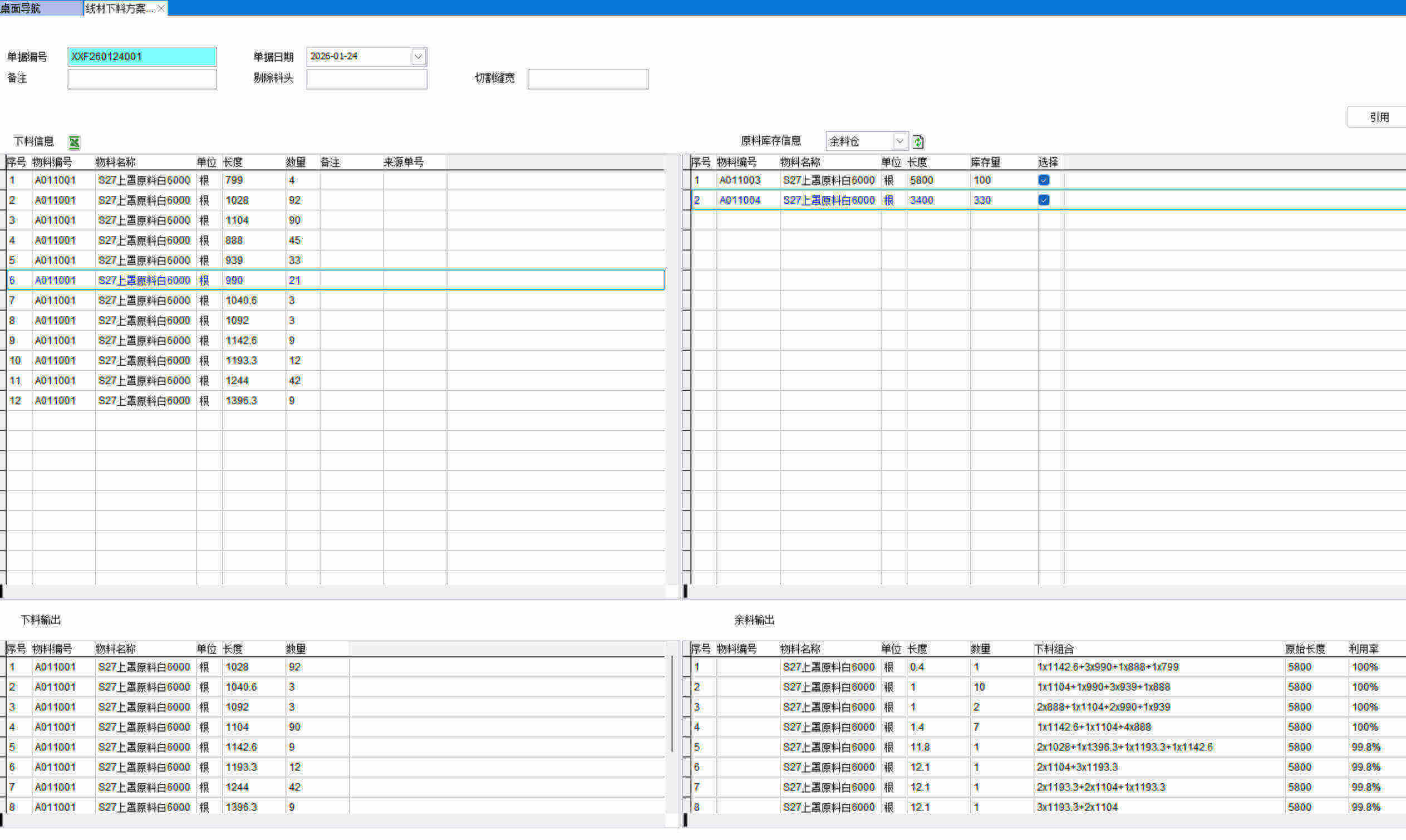 线材下料方案是机加工行业常用的下料优化软件,对线材、型材、钢管、卡纸计算最佳下料组合,市面上的下料优化软件都是单机版的,本功能是将下料优化软件整合到ERP中使用。