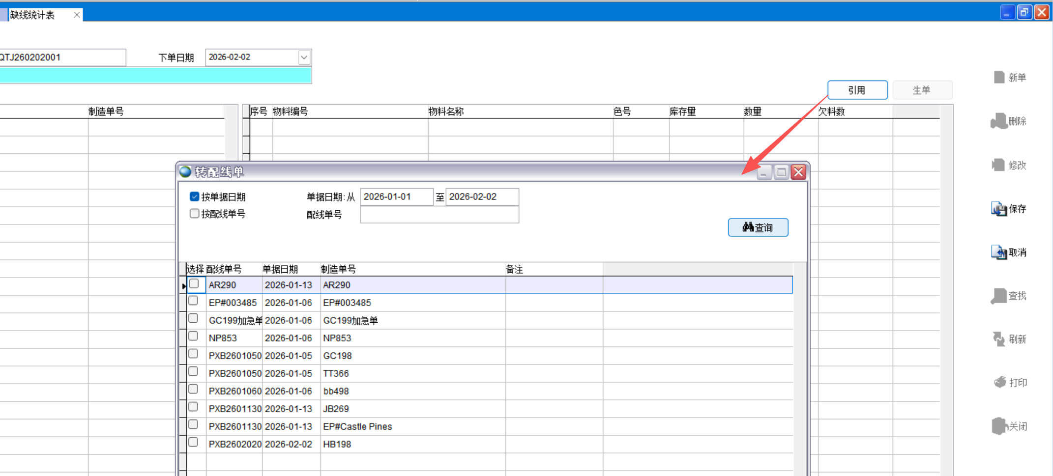 1、点新单、引用导入配线单数据