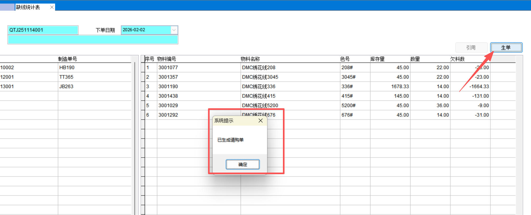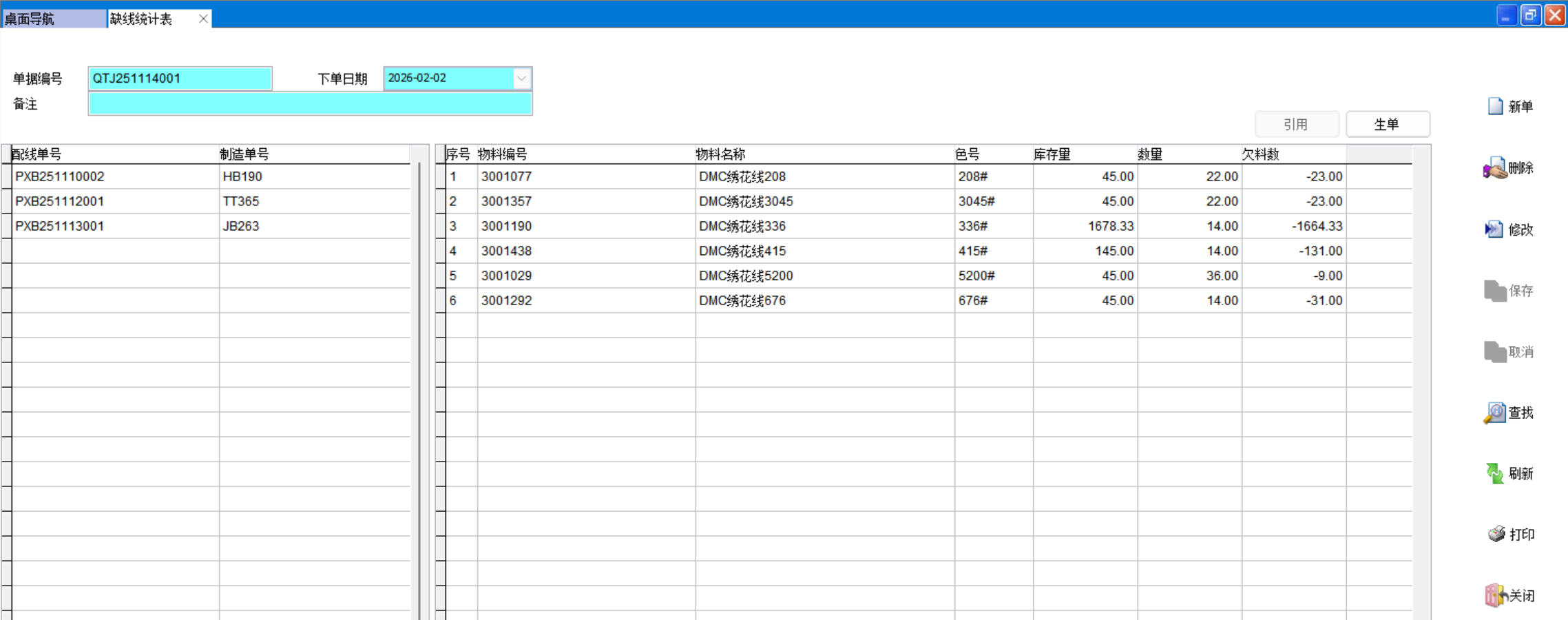 缺线统计表是将多个配线单按绣花线规格、色号进行数量合并,根据库存量计算出缺料数量,适用于绣线、服装、手工刺绣、喷绘等行业
