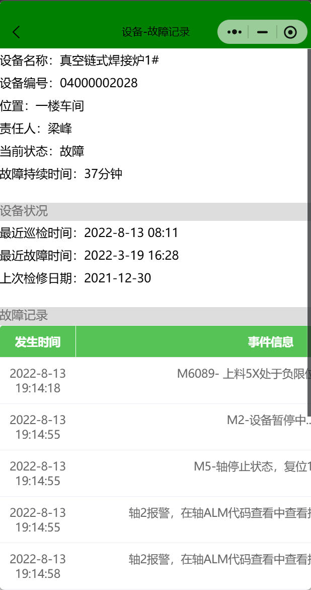 设备故障记录是设备维护的工作之一,数据来源有两部分,一部分来自使用巨灵鸟数据采集盒自动记录设备故障信息,另一部分是设备使用部门使用手机填写设备报修单,填写设备报修单比较常见。