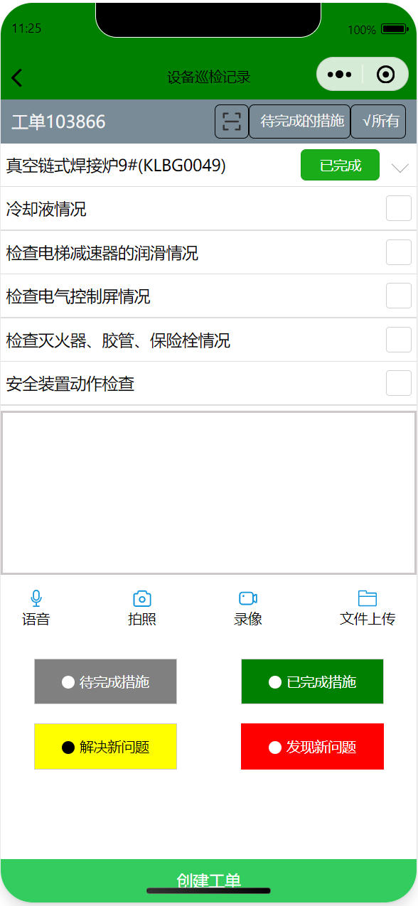 设备巡检包括点检和巡检结果记录,可以自动派送点巡检任务,支持拍照、录像、文字等多种方式记录