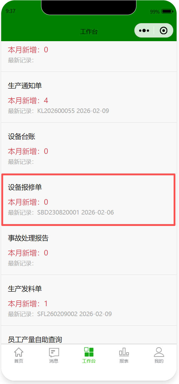 打开路径:【首页】-【工作台】-【生产】-【设备报修单】