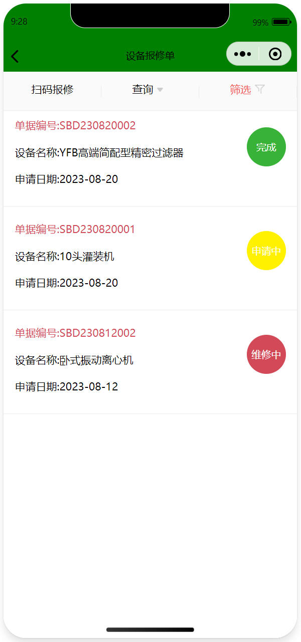 可以按条件筛选设备报修单,如按报修日期、申请人、状态等条件