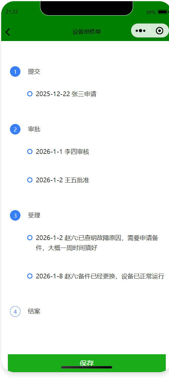 可以查看设备报修单进度