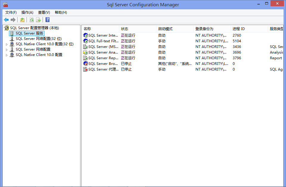 10、下面开始配置SSCM,打开SQL SERVER配置管理器,选中左侧的“SQL Server服务”,确保右侧的“SQL Server”以及“SQL Server Browser”正在运行
