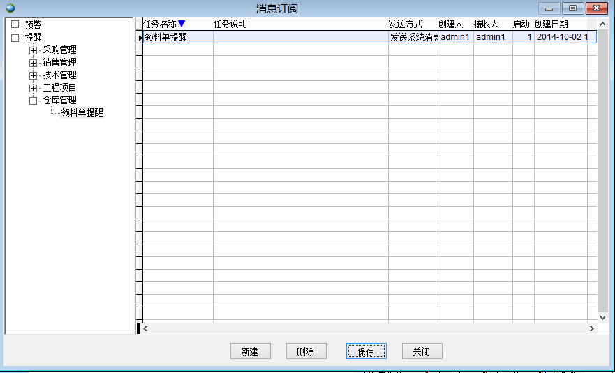 领料单提醒的消息订阅成功后当添加新的领料单时,在接收人的ERP中将弹出消息提醒窗口
