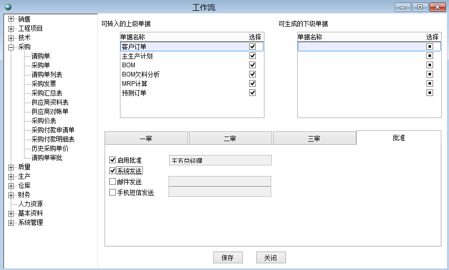 我们现在在ERP中实现这个流程,打开工作流选择请购单,如下图进行设置,不勾选启用二审、启用三审