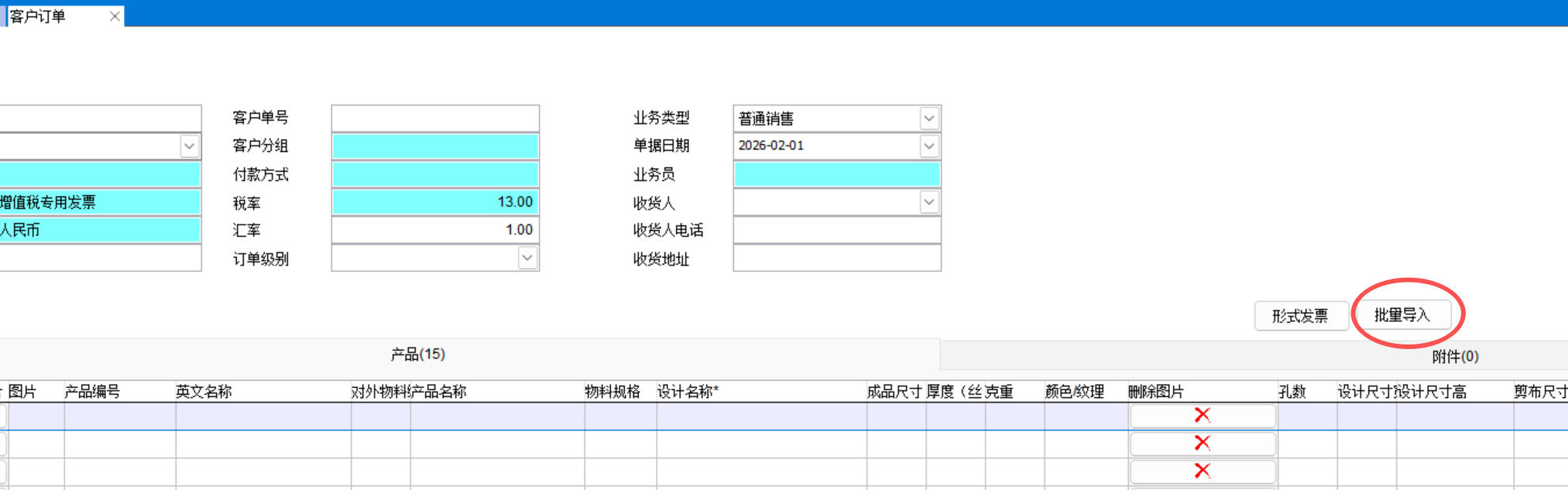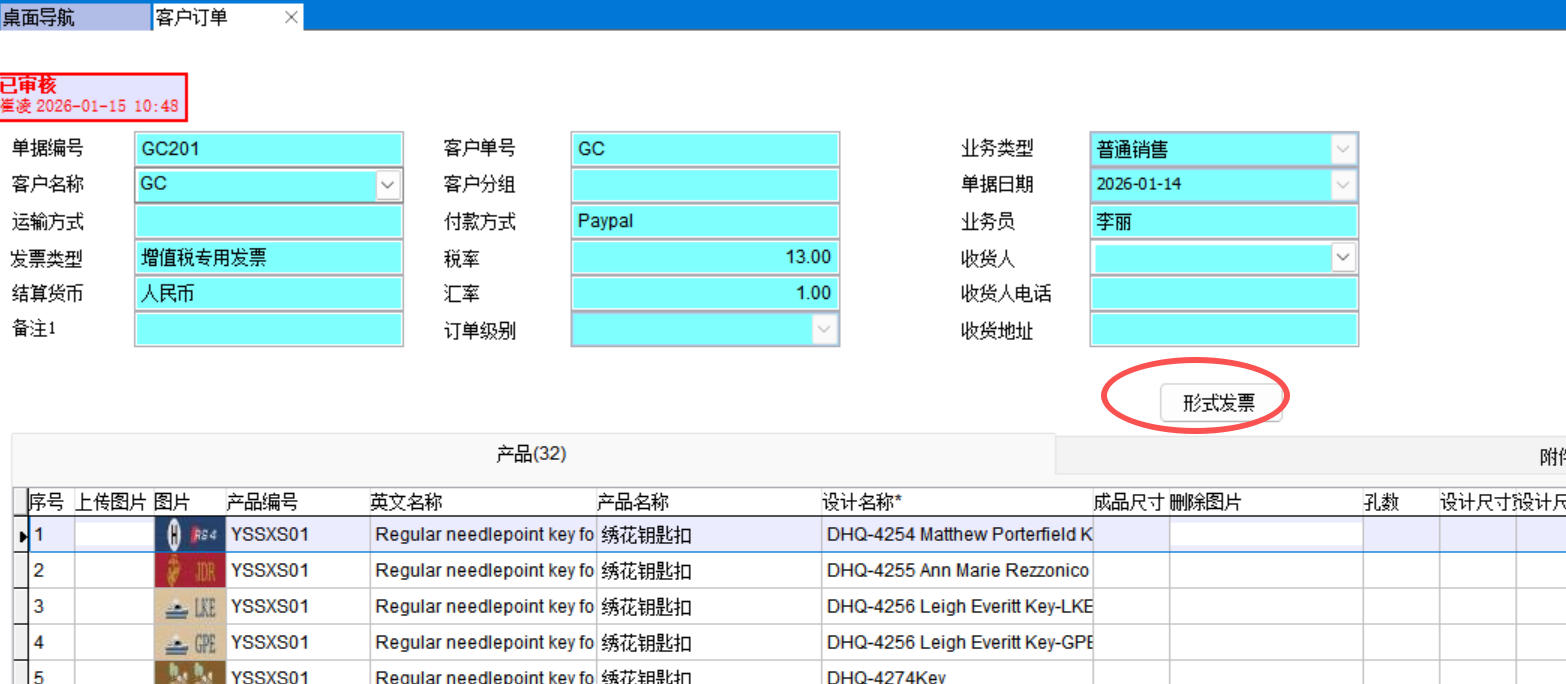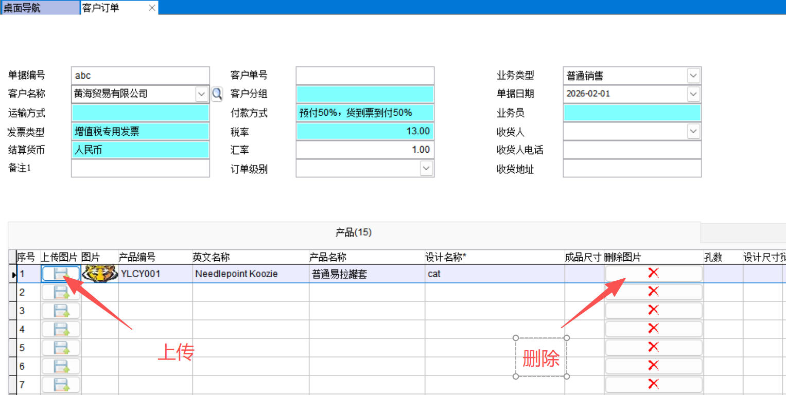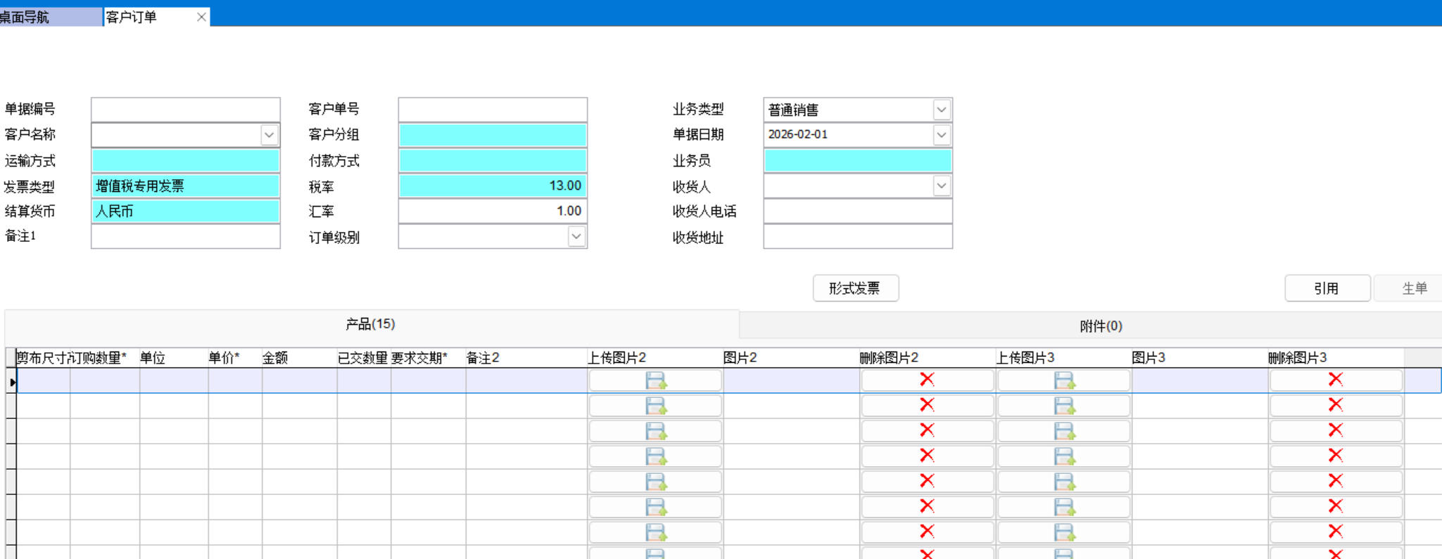 图片 图片功能默认是隐藏的,可以通过表体布局显示出来 图片是在物料编码表中上传,或在手机端的商品表中上传也可以,数据会同步到PC端 如果订单上的图片很多就会影响打开速度,可以设置只显示图片示意图 在配置文件中设置 设置后的效果 从客户订单上传图片 上面说的图片是在物料编码表中固定死的,但是如果用户每次订单的产品图片是变动的,也可以在客户订单中上传图片 多图片显示 如果一个产品都多个图片 形式发票 点击形式发票可以导出形式发票,适用于外贸企业 默认是没有形式发票按钮的,需要用表单布局显示出来 批量导入 客户订单可以批量导入 导入模板 收货人信息 收货人信息可以从客户订单手工输入,也可以在客户资料中提前维护进去 业务类型 客户订单有两种业务类型:普通销售、直运销售 直运销售就是购买其他公司的产品销售给客户,直运销售可以和直运采购业务结合使用,没有实物出入库。货物流向是直接从供应商到客户,财务结算通过销售发票、采购发票解决。详见直运业务 相关知识 项目名称