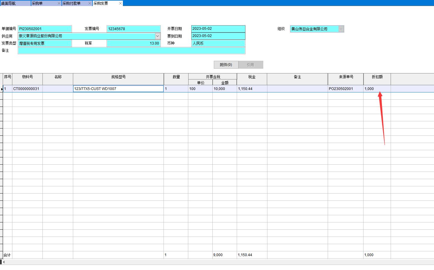 假设采购订单1万,到货金额也是1万,现在供应商给予10%折扣,开票金额还是1万,折扣1000元,最后只要付0.9万