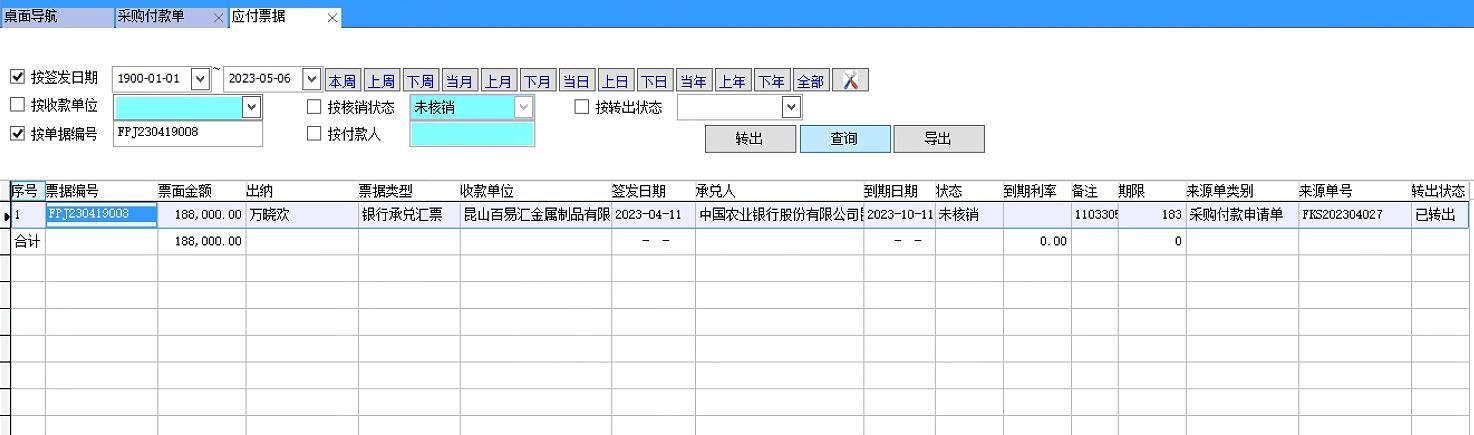 假设我方给供应商开具一张承兑汇票先做到期要从帐户付款,在应收票据中点转出即可生成采购付款单