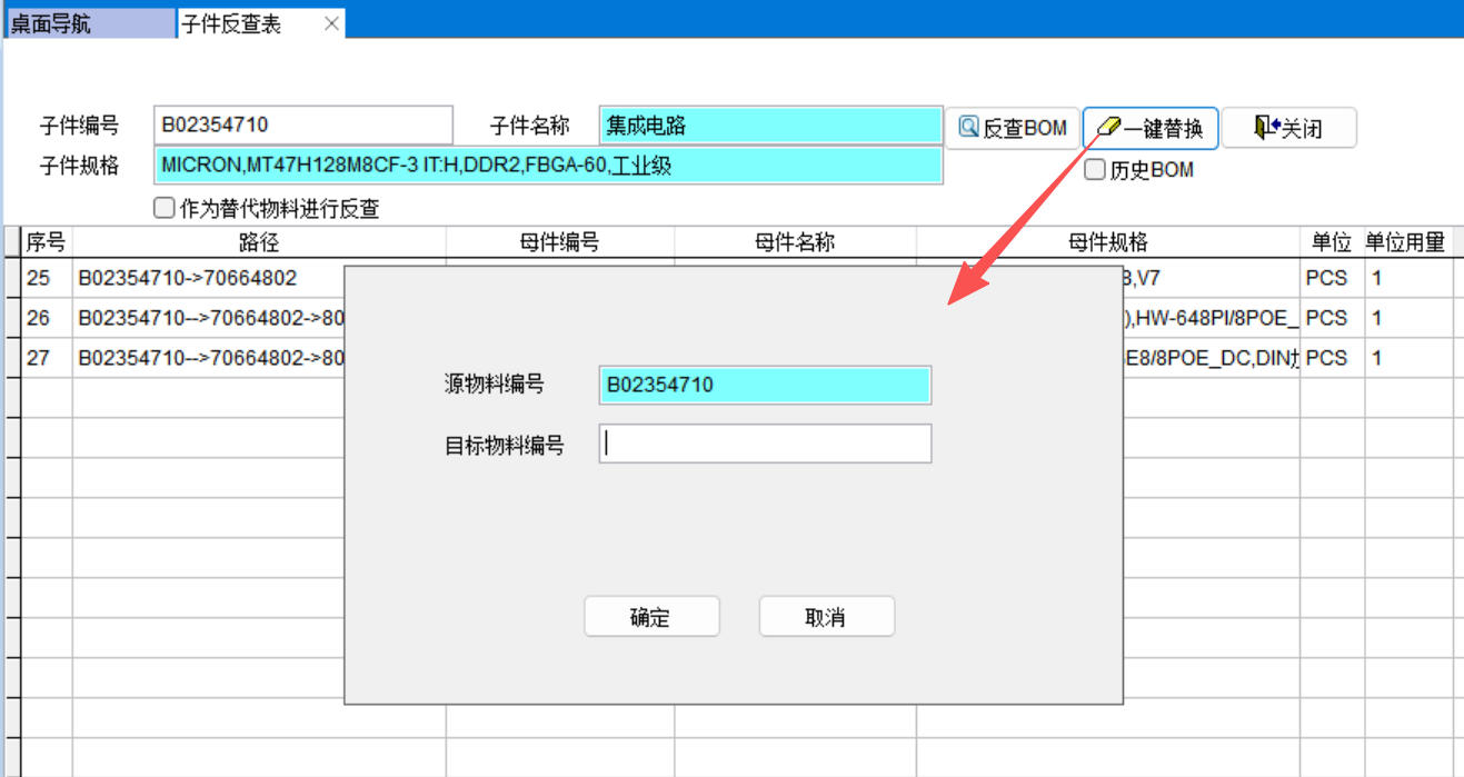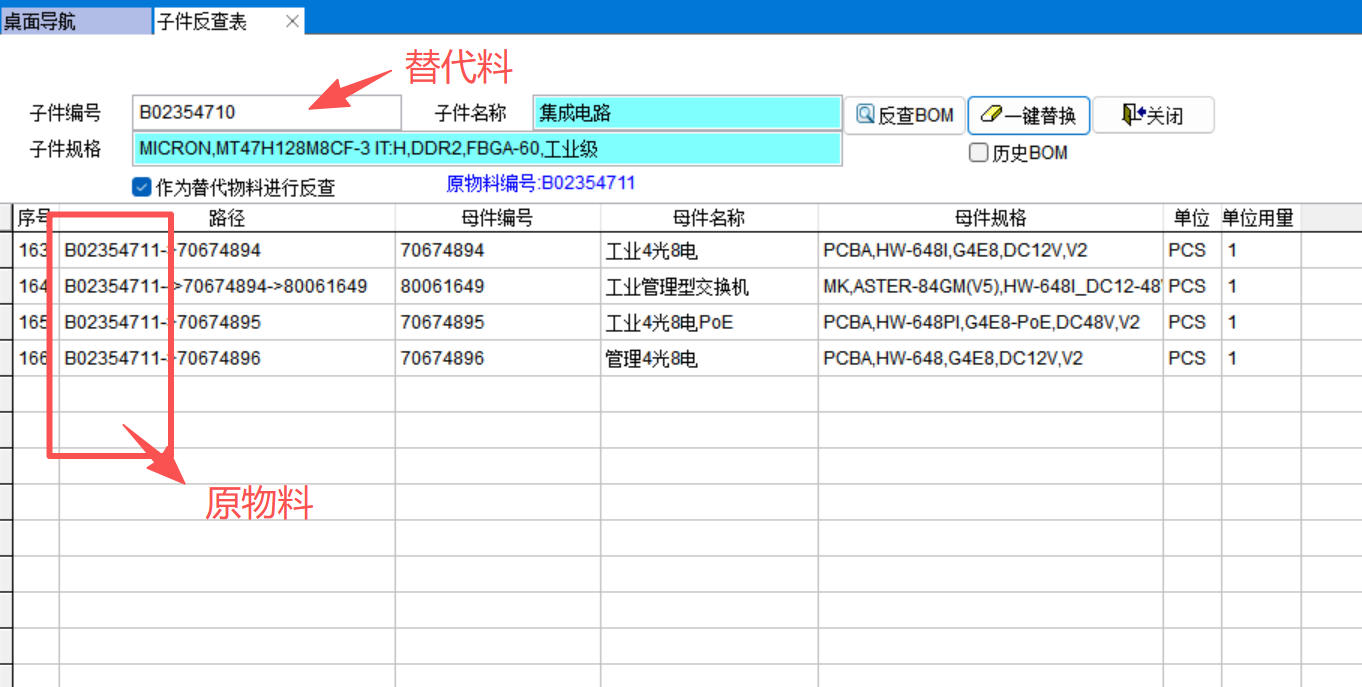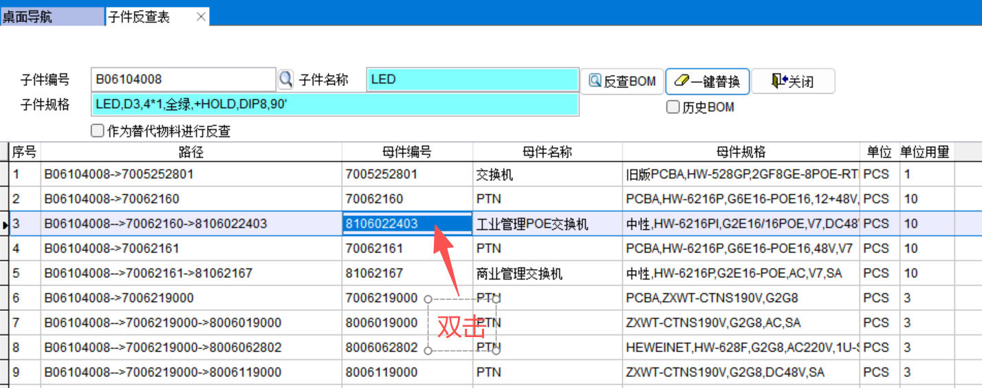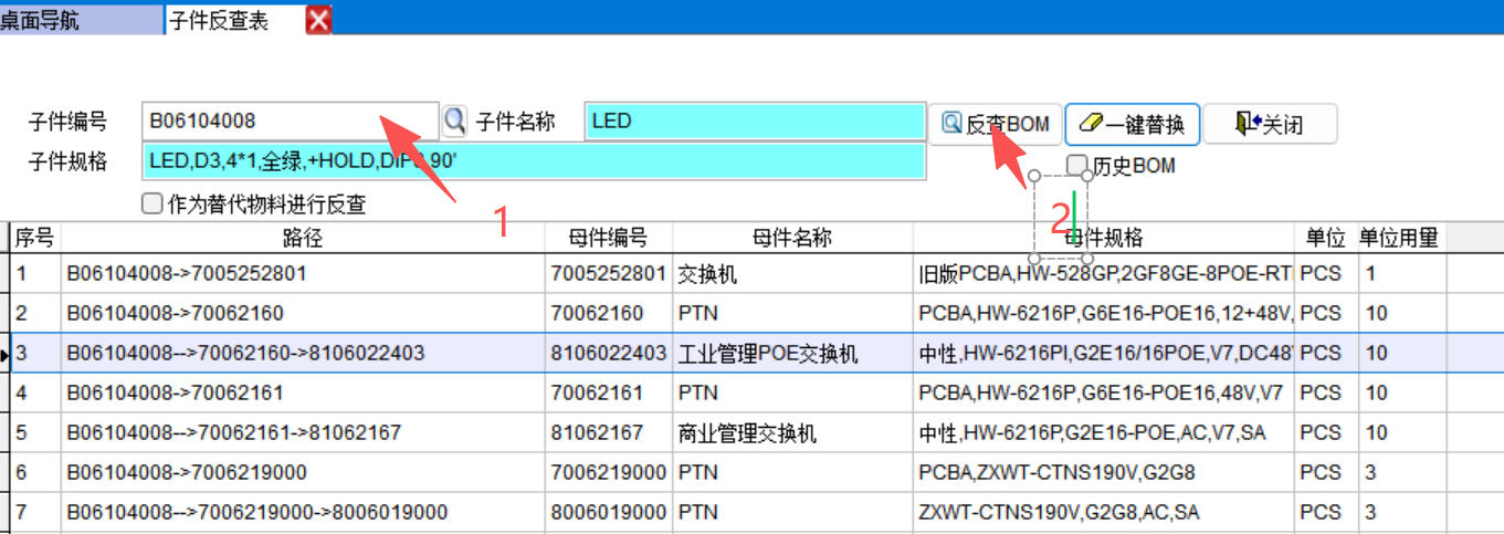 子件反查表就是查某个物料在哪些BOM中存在,同时能显示BOM的层级路径,能一键替换所有BOM。