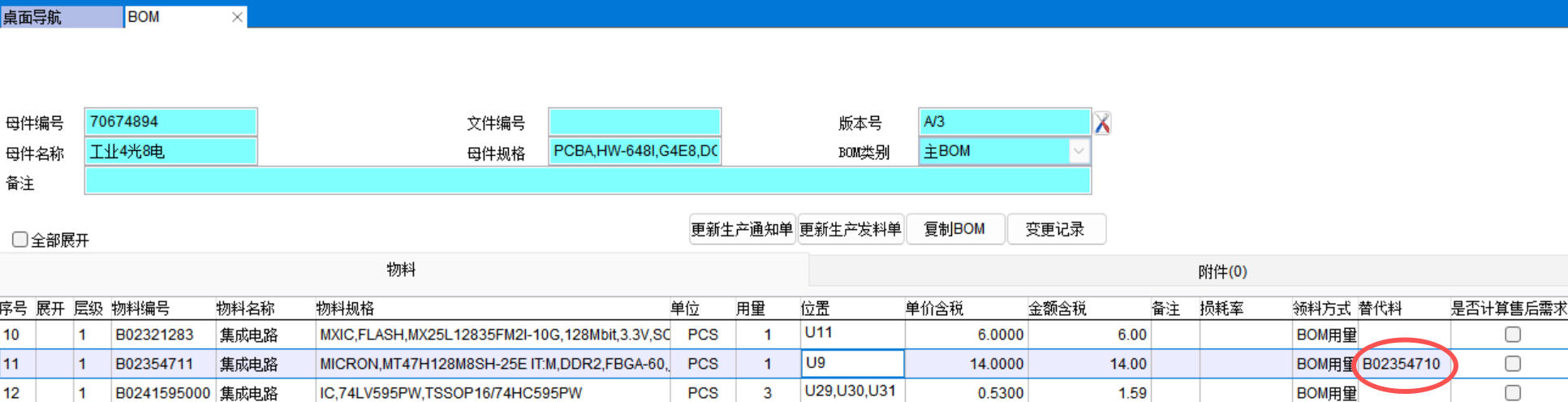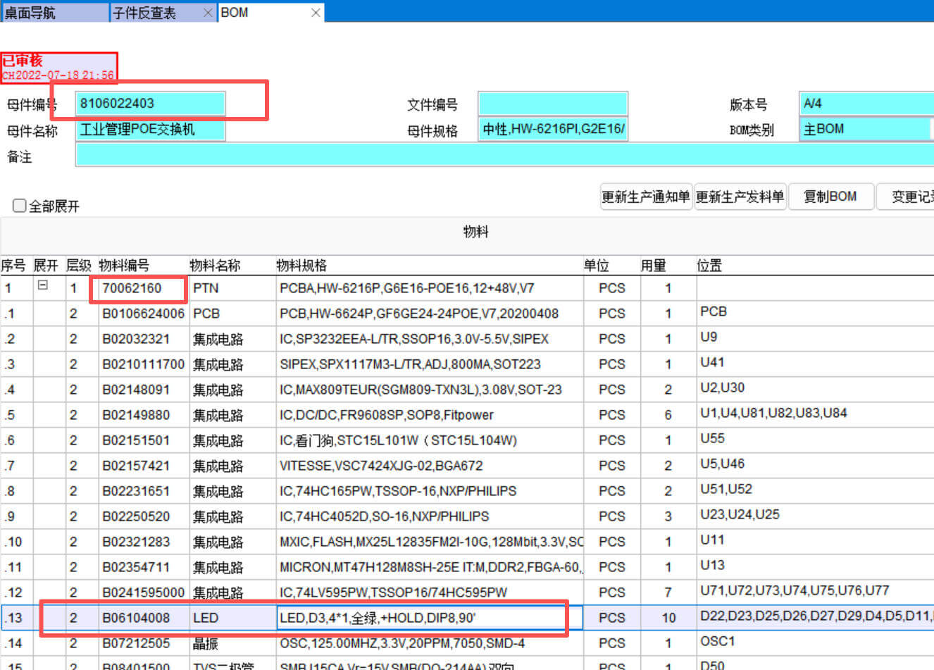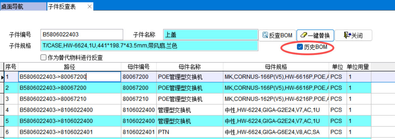 勾选了历史BOM可以反查历史BOM,下图中历史BOM用绿色标识