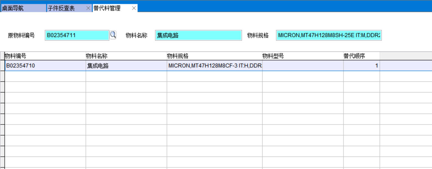 先在替代料管理中设置了替代料关系,然后按替代料关系进行查询